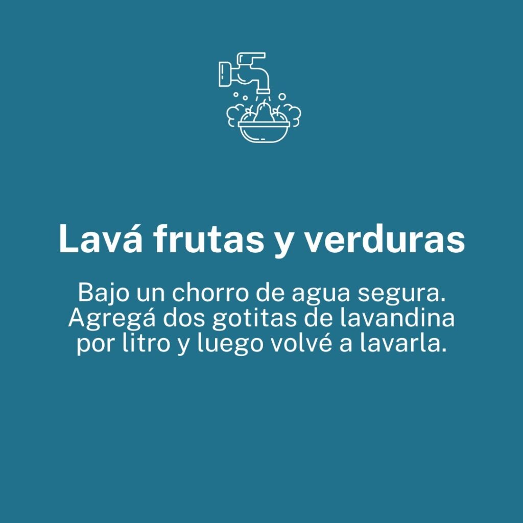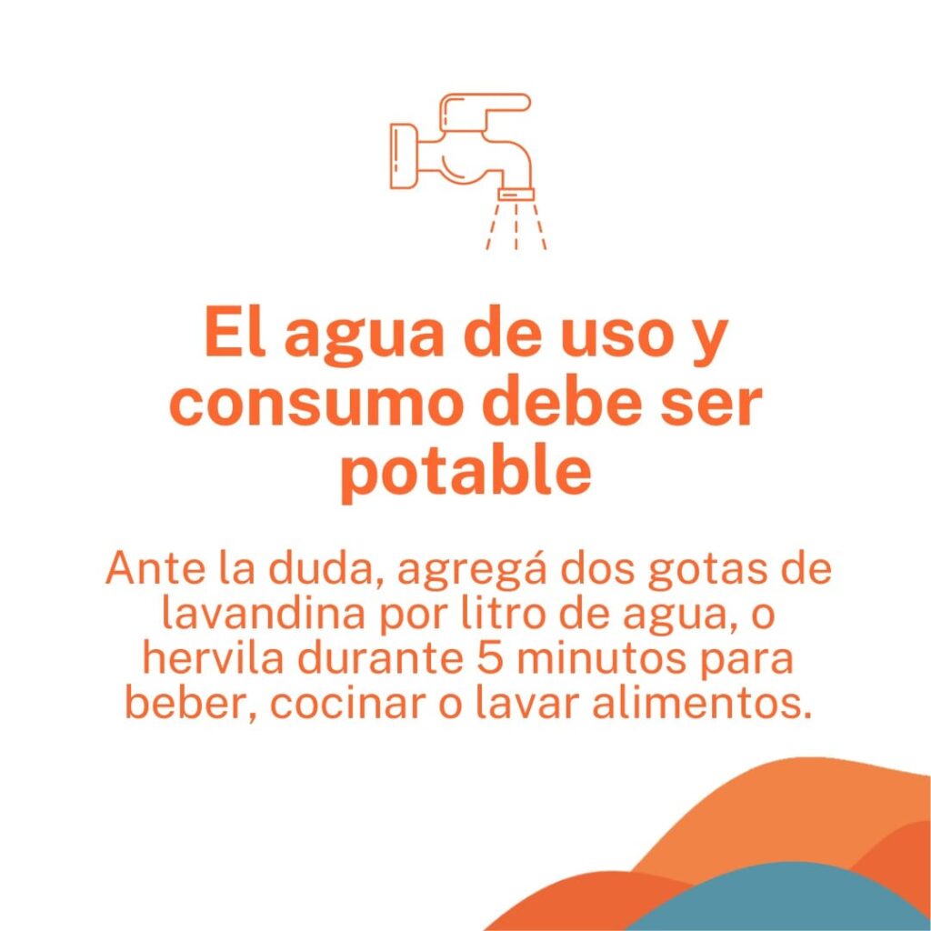 Además, el agua de uso y consumo debe ser potable. Ante la duda agregar 2 gotas de lavandina por cada litro de agua, o hervirla durante 5 minutos para beber, cocinar o lavar los alimentos. También se recomienda bañarse en aguas recreacionales seguras.