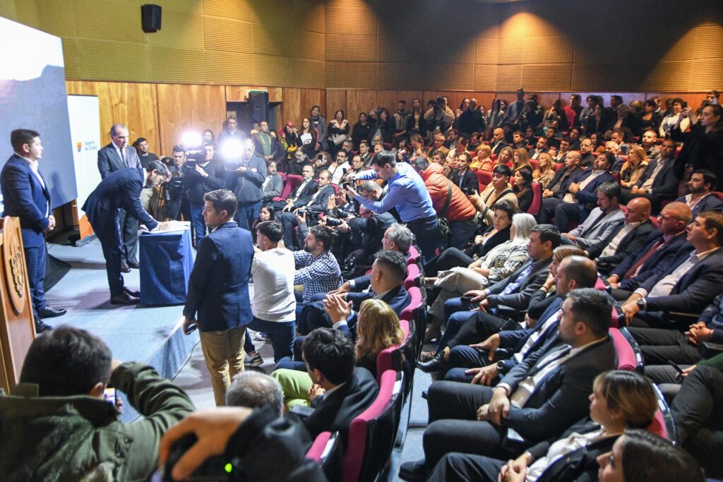 El intendente de Puerto Madryn, Gustavo Sastre, estuvo hoy en el acto que se llevó a cabo en la localidad de Trelew, donde el gobernador de Chubut, Ignacio Torres, firmó un convenio con las autoridades de Pan American Energy para avanzar en la explotación de Shale Oil en Cerro Dragón.