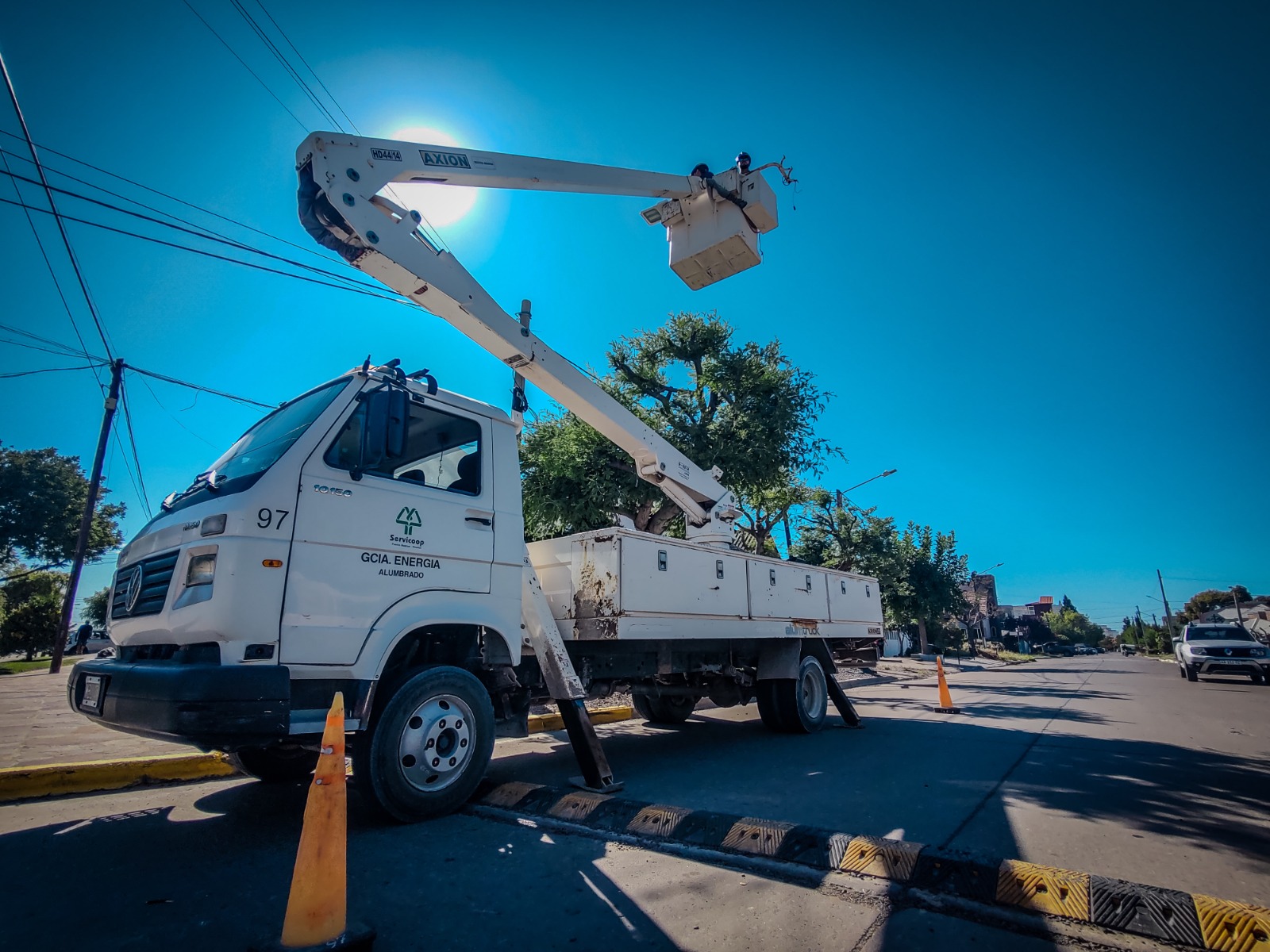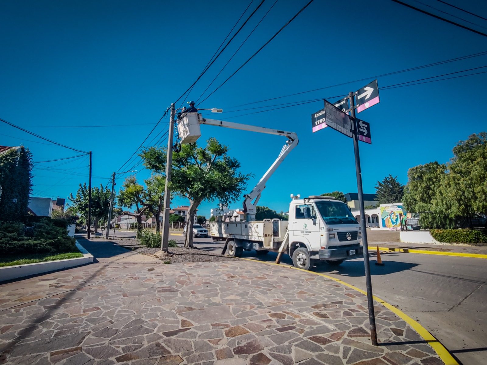 Cada vez que se realiza un cambio de poste o una columna del tendido eléctrico, nuestro personal de alumbrado debe realizar la instalación de la luminaria retirada al realizar el recambio de poste o columna. En esta ocasión se repuso la luminaria sobre la intersección de Matthews y Roberts.