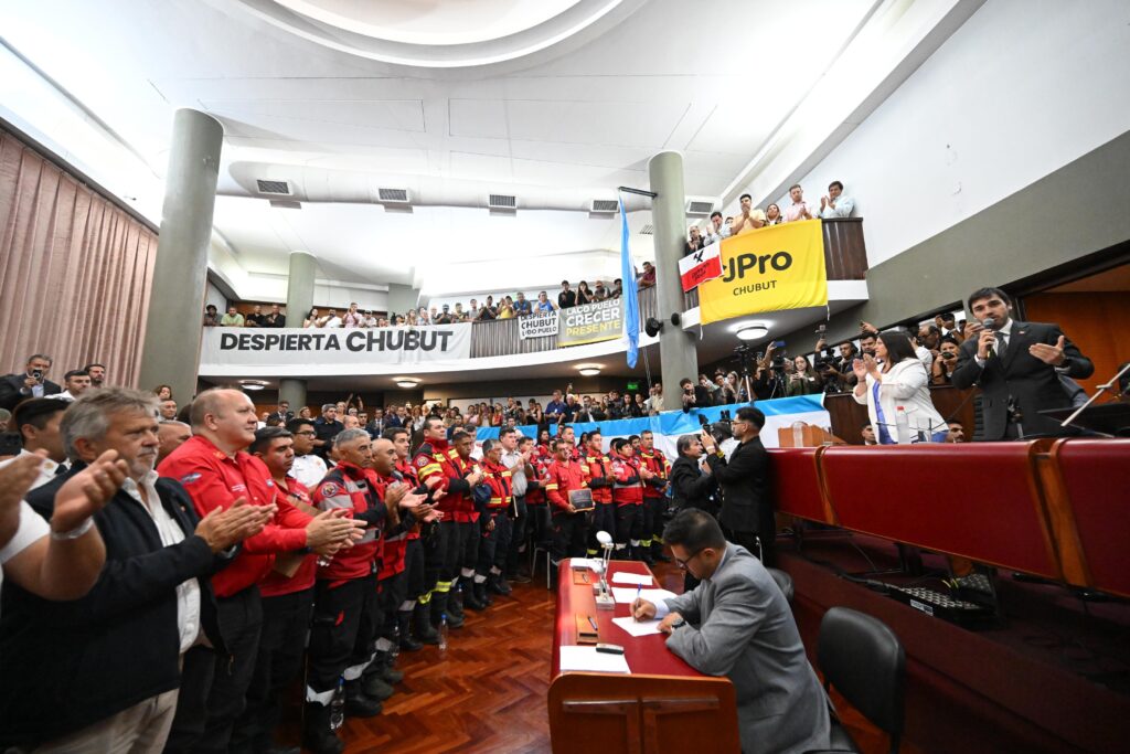 Torres inició su alocución pidiendo «un fuerte reconocimiento y aplauso a los verdaderos héroes de este año, que pusieron el cuerpo, arriesgaron su vida y mostraron que nuestros brigadistas y bomberos voluntarios son el ejemplo de resiliencia y vocación de servicio, siendo un orgullo para todos los chubutenses», lo cual derivó en una extensa ovación de todos los presentes, con el saludo personal del Gobernador, quien descendió al recinto para felicitar a cada uno de los representantes de dicho sector.