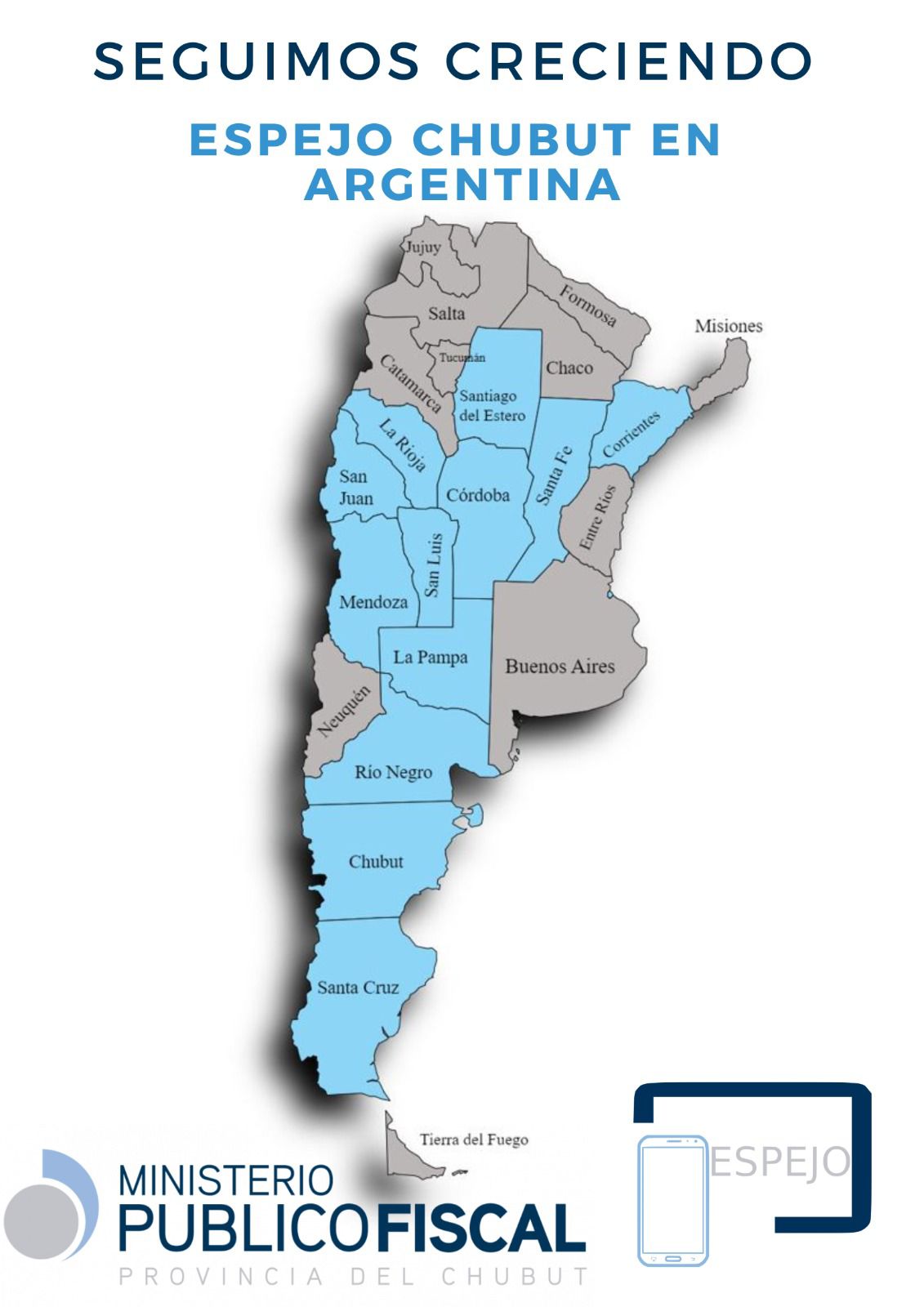 “Espejo Chubut” fue presentado por primera vez en el 2do Encuentro Nacional de Cibercrimen del OCEDIC, desarrollado en Puerto Madryn. Luego, fue puesto a disposición de todo el país por el Procurador General de Chubut, Jorge Miquelarena, en las “XXXIV Jornadas Nacionales de los Ministerios Públicos Fiscales”. Desde allí ha sido cedido de manera gratuita por Chubut e implementado por las provincias de Santa Cruz, Río Negro, La Pampa, Mendoza, San Luis, Córdoba, San Juan, La Rioja, Santa Fe, Santiago del Estero y Corrientes. En los últimos meses, además, se sumaron la Ciudad Autónoma de Buenos Aires y la provincia de Catamarca. Misiones fue la última provincia en solicitarlo y el próximo martes 26, Guillermo Figueredo, a cargo del Departamento de Informática Forense del MPF y uno de los principales desarrolladores del software, será el encargado de presentarlo en dicha provincia.