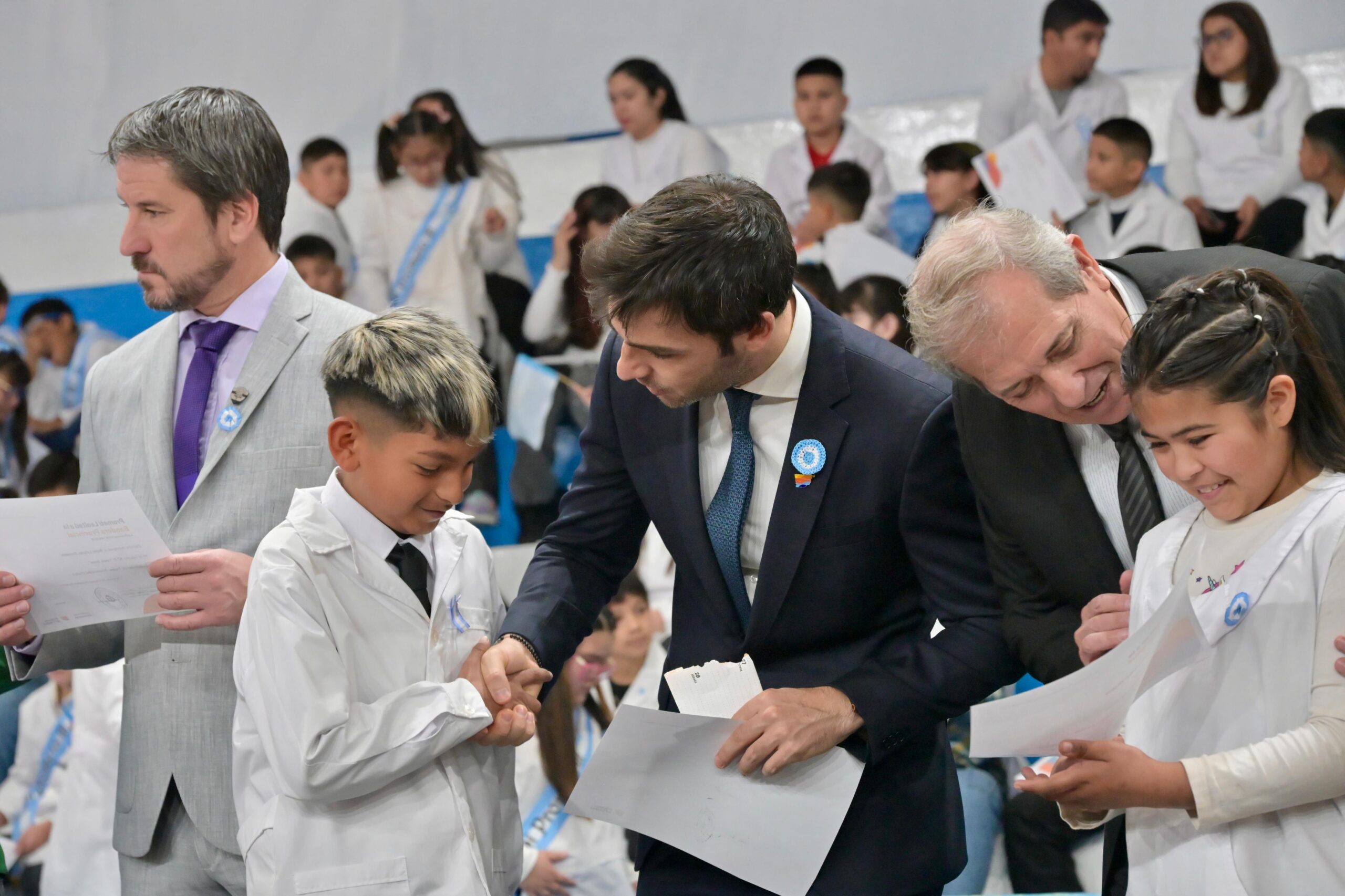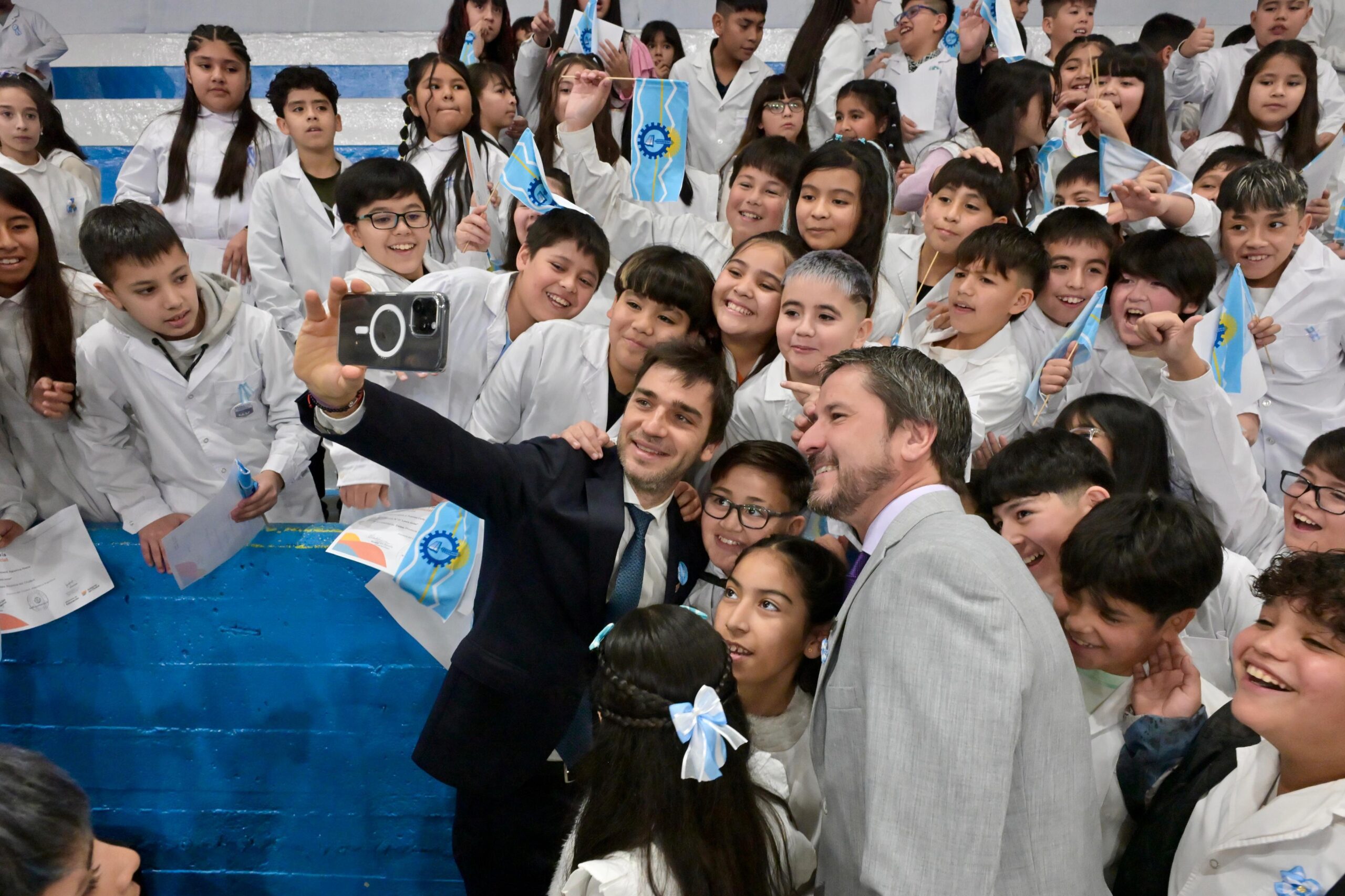 El Gobernador también realizó la toma de juramento a la Bandera de la Provincia de Chubut a estudiantes de 4°, 5° y 6° año, en el marco de la Ley VIII N° 149/25, que estableció esta nueva ceremonia.