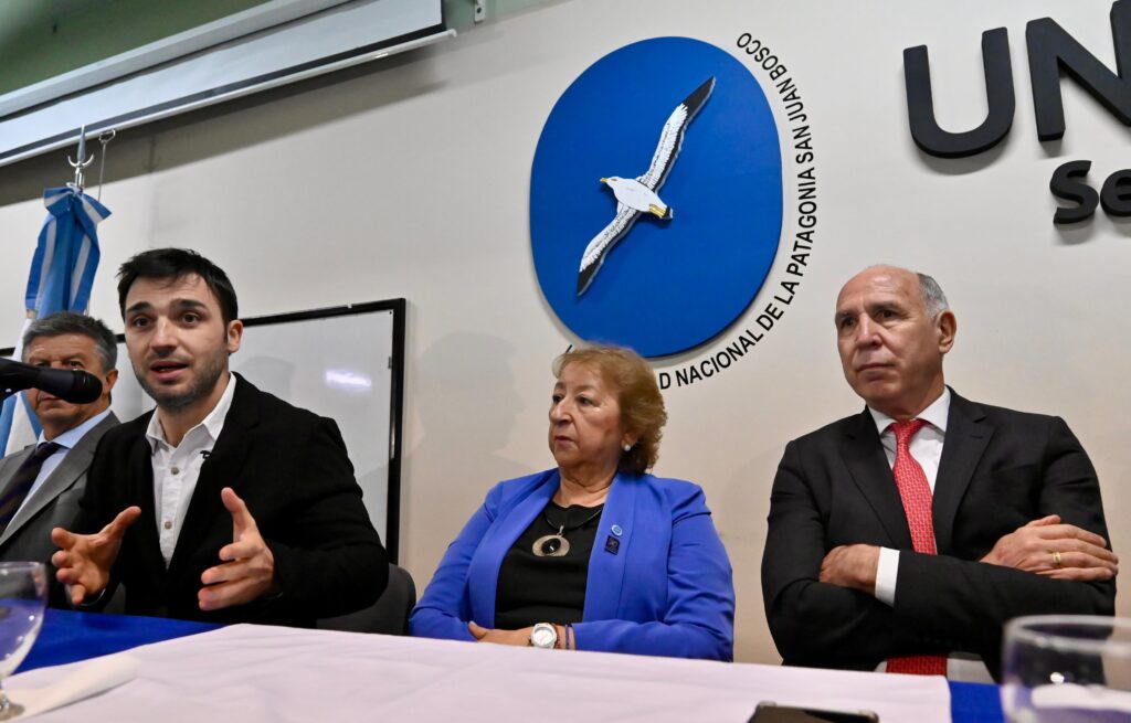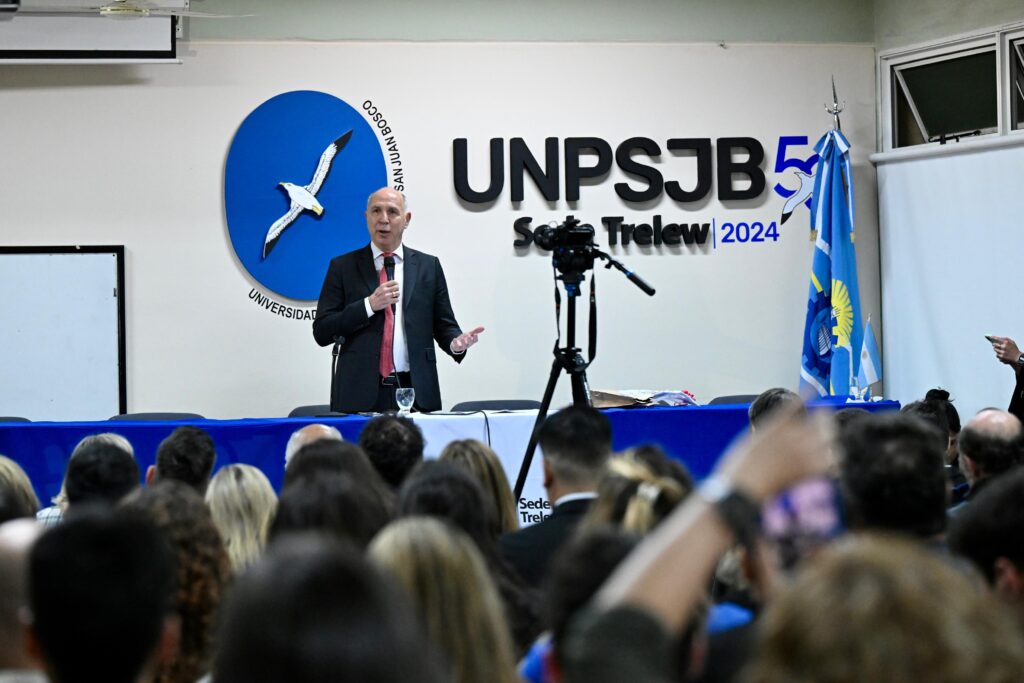 Ante un aula colmada de estudiantes, docentes y funcionarios provinciales y municipales, y como preludio a la clase magistral brindada por Lorenzetti en la sede Trelew de la universidad, el gobernador de Chubut, Ignacio “Nacho” Torres, dio un discurso durante el cual subrayó el rol de la universidad pública en el desarrollo de la sociedad, «cuya importancia estratégica debemos defender entre todos», enfatizando, además, la necesidad de construir «un país federal y republicano”.
