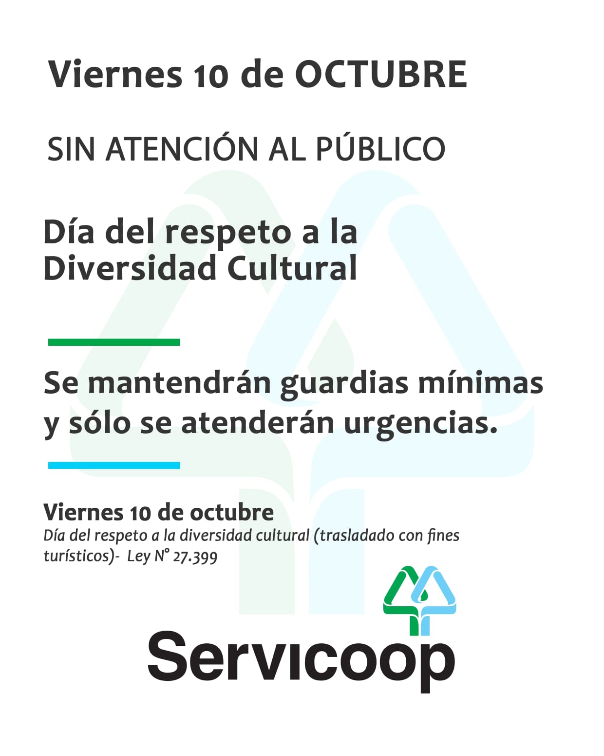 Informamos a todos los usuarios y a la comunidad en general, que mañana viernes 10 de octubre, nuestras oficinas permanecerán cerradas, debido al feriado nacional establecido por la Ley 27.399. Se mantendrán en operaciones las guardias mínimas y solo se atenderán urgencias.