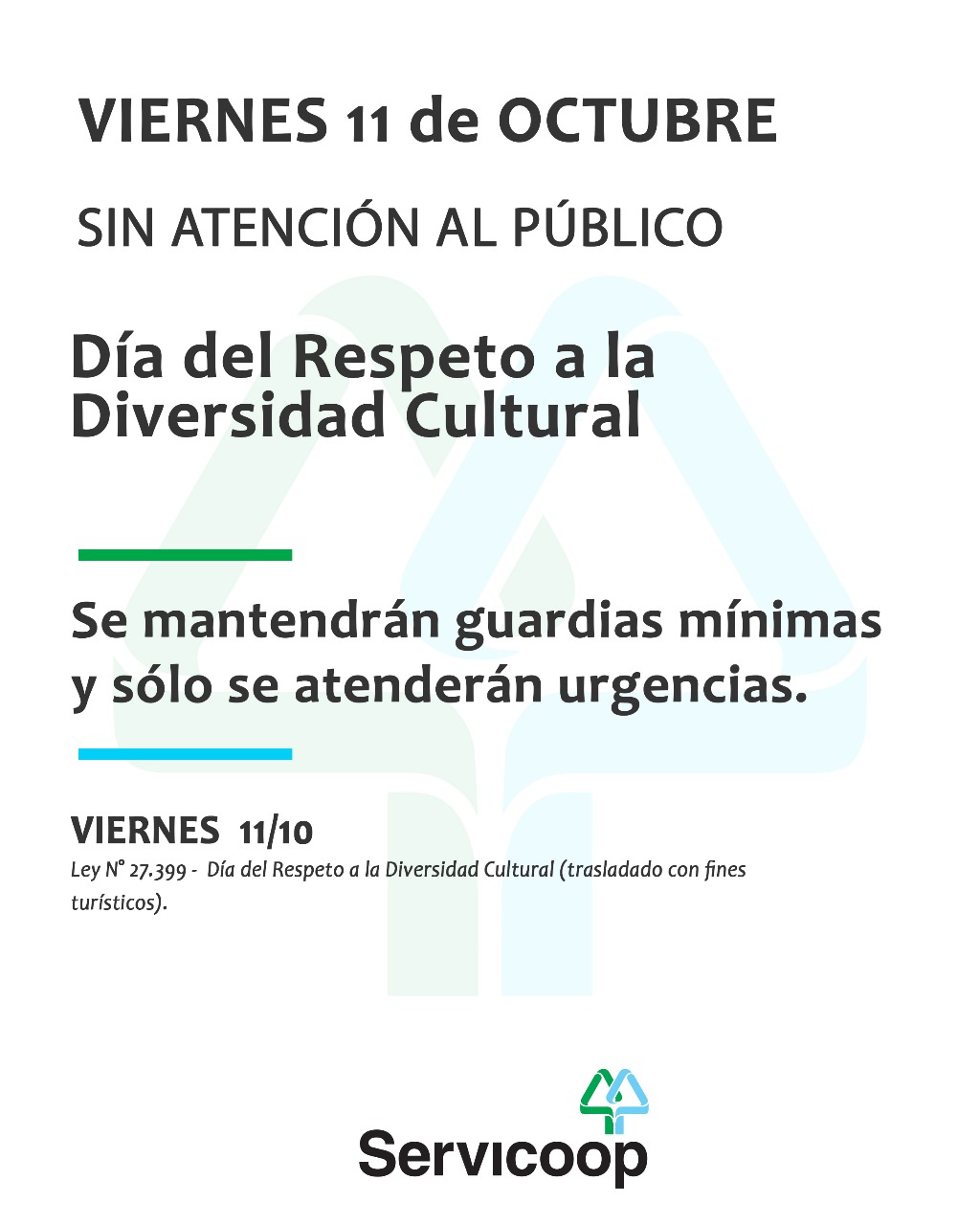Informamos a la comunidad en general que mañana viernes 11 de octubre, nuestras oficinas permanecerán cerradas, debido al feriado que conmemora el Día del Respeto a la Diversidad Cultural. Se mantendrán en operaciones las guardias técnicas mínimas y solo se atenderán urgencias.
