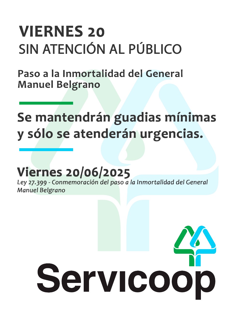 Informamos a todos los usuarios y a la comunidad en general que, mañana viernes 20 de junio, nuestras oficinas permanecerán cerradas, debido al feriado que conmemora el paso a la inmortalidad del General Manuel Belgrano. Se mantendrán en operaciones las guardias técnicas mínimas y sólo se atenderán urgencias.